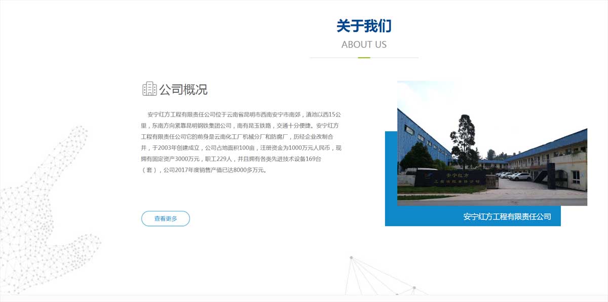 安寧紅方工程有限責(zé)任公司它的前身是云南化工廠機(jī)械分廠和防腐廠,歷經(jīng)企業(yè)改制合并,于2003年創(chuàng)建成立,公司占地面積100畝,注冊(cè)資金為1000萬元人民幣,現(xiàn)擁有固定資產(chǎn)3000萬元,職工229人,并且擁有各類先進(jìn)技術(shù)設(shè)備169臺(tái)(套),公司2017年度銷售產(chǎn)值已達(dá)8000多萬元。